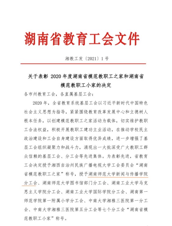 近日,湖南省教育工会发布《关于表彰2020年度湖南省模范教职工之家和湖南省模范教职工小家的决定》,我院获评“湖南省模范教职工小家”荣誉称号,标志我院工会工作取得新成效。