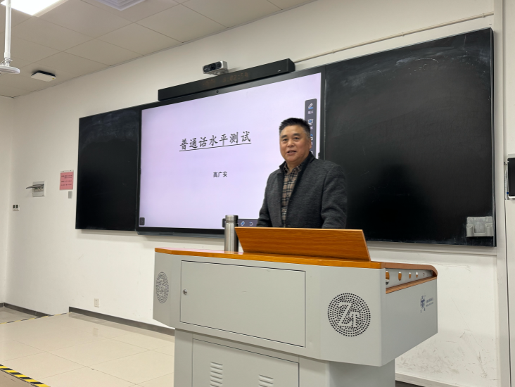 讲座过程中,高广安老师结合自己多年的从业经历,以“学习普通话的诀窍”为问题导入,分别从“等级设置与标准”“考试题型”“考试内容”以及“注意事项”四个方面对普通话测试水平测试进行了详细说明,并带领学生们进行模拟考试,分析考试过程中可能遇到的重难点与易错点,以帮助学生们科学备考。
