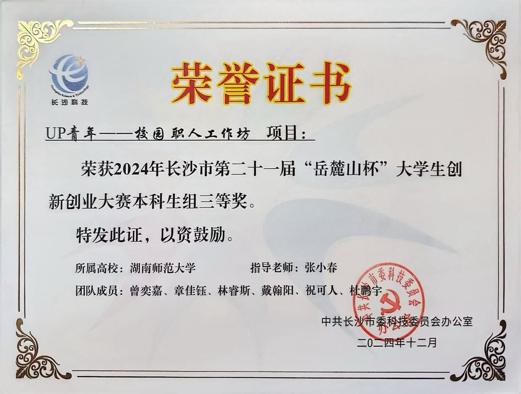 (通讯员 曾奕嘉)2024年11月26日,长沙市第二十一届“岳麓山杯”大学生创新创业大赛决赛在湖南湘江基金小镇圆满落幕。我院2022级曾奕嘉同学带队的《UP青年-校园职人工作坊》项目,在指导老师张小春老师的指导下荣获三等奖。