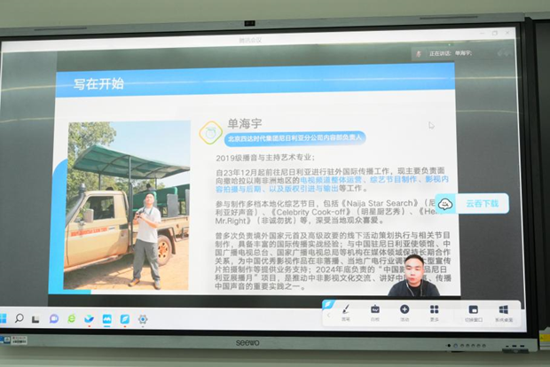 (通讯员 石禹炘 吴欣玥 蒲晨溪)4月24日晚,在yl23411永利集团301教室,以“国际传播视野下的影视制作与运营策略”为主题的“校友回家”分享会在此举行。作为播音专业的优秀校友,现北京四达时代集团、尼日利亚NTA-Star TV Network Ltd.内容部负责人单海宇重返母校,通过线上线下同步直播,与《中华文化国际传播》《网络视听国际传播》的40余名师生共话国际影视传播的前沿实践与文化融合之道。