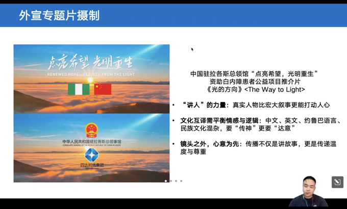 讲座中,单海宇以撒哈拉以南非洲地区的工作经历为核心,揭秘跨国综艺的“文化适配”法则。他以尼日利亚爆款节目《Naija Star Search》(尼日利亚好声音)为例,分享团队如何将当地传统鼓乐、民间故事与流行综艺赛制结合:“我们没有直接复制原版模式,而是深入研究尼日利亚观众对‘家庭情感’‘社区认同’的重视,在选手故事线中融入非洲本土文化元素,让节目既具国际视野,又成为本土观众的‘文化镜子’。”而在谈及公益宣传片《光的方向》的创作历程,单海宇强调“倾听”是跨文化传播的前提:“拍摄尼日利亚白内障复明项目时,我们在诊所蹲守两周,记录患者触摸亲人脸庞时的第一句‘我看见你了’。这种真实的情感共鸣,比任何宏大叙事都更有力量。”他指出,国际传播不应是“文化输出”,而需成为“文化翻译”,通过挖掘人类共通的情感母题,让中国故事自然融入当地语境。