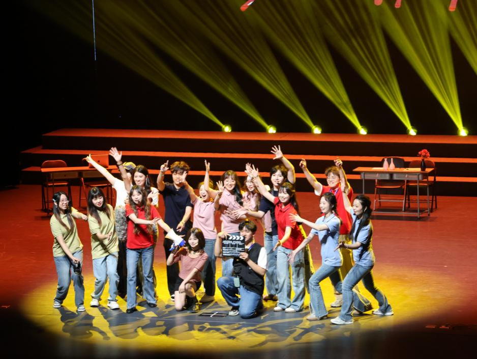 晚会节目的编排也颇具新意,音乐情景剧《重生之我在片场》以幽默演绎致敬创作初心,生动诠释了编导生们在创作过程中的思考与在场;从业于各大传媒机构、文化教育、企业宣传等工作岗位的优秀学长学姐发来祝福视频,他们以“我在”的自信姿态和激励话语点燃了全场;最后,每一部短片的主创团队轮流上场谢幕,同学们大合唱歌曲《我在I’m Here》,将现场气氛推向高潮。