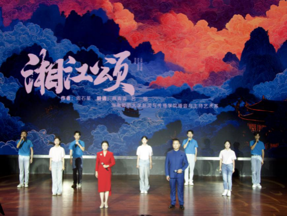 湖南师大播音系学子们参演朗诵会核心节目。在开场表演《梦系浏阳河》中,他们化身湖湘文脉的寻梦者与传颂者,用声线勾勒出"弯过九道弯"的百里画廊,将奔流不息的河韵与生生不息的乡愁熔铸成动人的声音史诗了;在象征希望的《一粒好种子,种在校园里》中,他们的声音如春雨润物般细腻,也似新芽破土般铿锵,迸发出扎根乡土、振兴乡村的青春誓言;在朗诵会尾声《湘江颂》中,学子们又以磅礴的声浪礼赞母亲河,引发全场雷鸣般的掌声。湖南师大播音学子以昂扬的风貌、扎实的功底与深沉的家国情怀,立体呈现了学院卓越育人成果和新时代青年的精神气象。