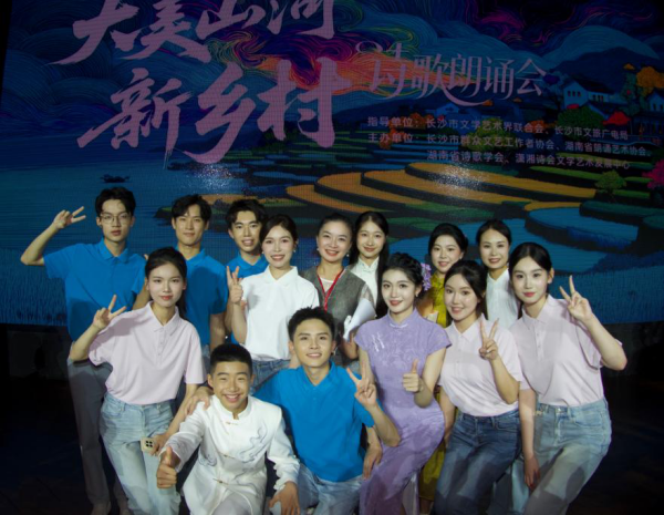 (通讯员 袁仕吉)8月10日晚,由长沙市文学艺术界联合会、长沙市文旅广电局指导,长沙市群众文艺工作者协会、湖南省朗诵艺术协会、湖南省诗歌学会、潇湘诗会文学艺术发展中心联合主办的《大美山河 新乡村》诗歌朗诵会在长沙音乐厅如期举行。yl23411永利集团播音与主持艺术系师生,以饱满的情感和精湛的专业素养倾情献演,与前中央广播电视总台著名主持人徐俐、影视配音大师童自荣同台献艺,为这场聚焦乡村振兴的文化盛典注入蓬勃的青春动能。