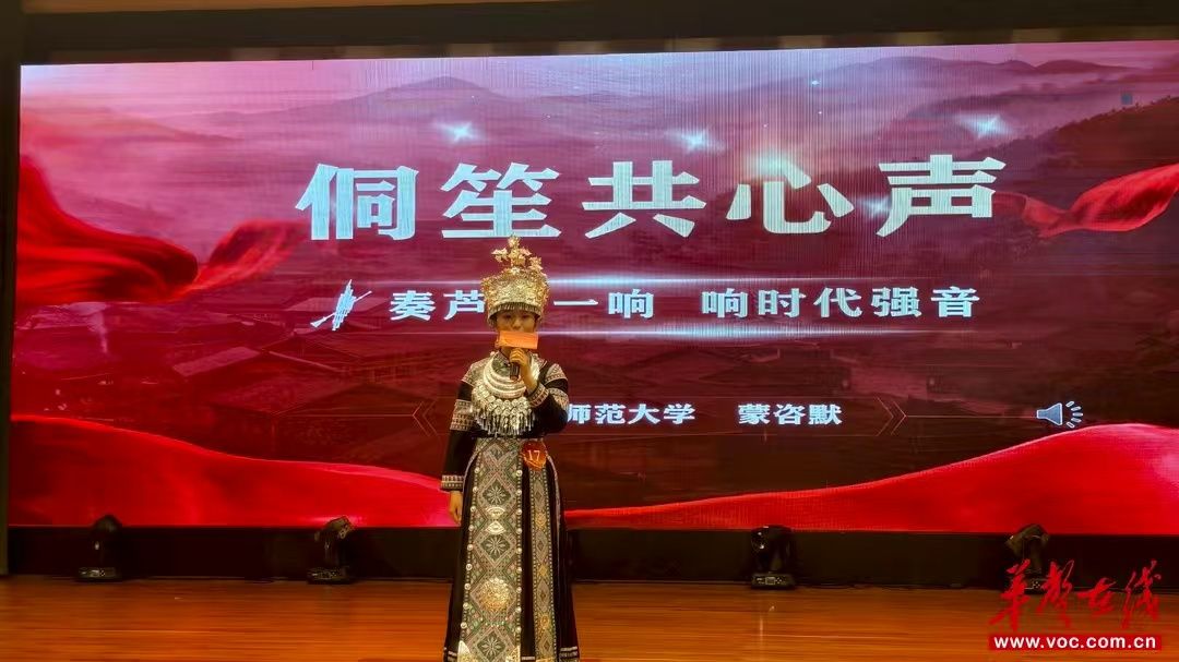 比赛中,蒙咨默以侗家特色乐器“侗笙”为切入点,围绕“中华民族心手相连、共鸣共情”展开演讲。她巧妙提炼“侗笙”的三重共鸣内涵,分别阐释“团结是历史的选择”“团结是主动的担当”“团结是青春的使命”,生动诠释“长管低吟红色韵,新簧高唱时代歌”的主题深意。演讲过程中,她通过“侗笙”“小马灯”“杨奥大哥的故事”“我命由我不由天的民族精神”等鲜活元素,真情抒发当代青年为民族团结、中国式现代化挺膺担当的青春志向,赢得评委与现场观众的高度认可。