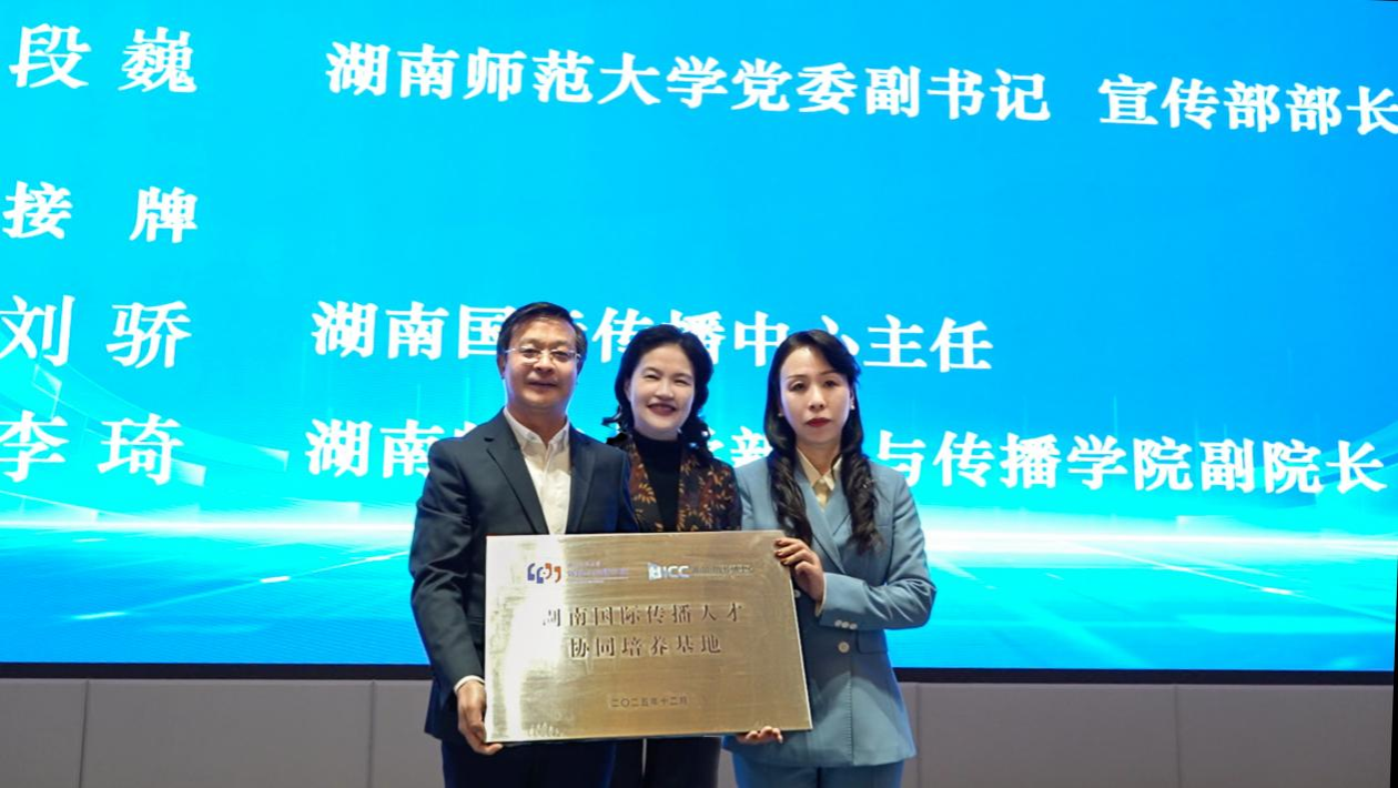 开幕式上举行了授牌仪式。yl23411永利党委副书记、宣传部部长段巍向湖南国际传播中心主任刘骄、yl23411永利集团副院长李琦共同授予“湖南国际传播人才协同培养基地”牌匾。该基地的成立,标志着高校学术资源与地方媒体平台进入实质性协同阶段,将为学生的专业实习、项目实践、课题研究及师资互聘提供稳定平台。