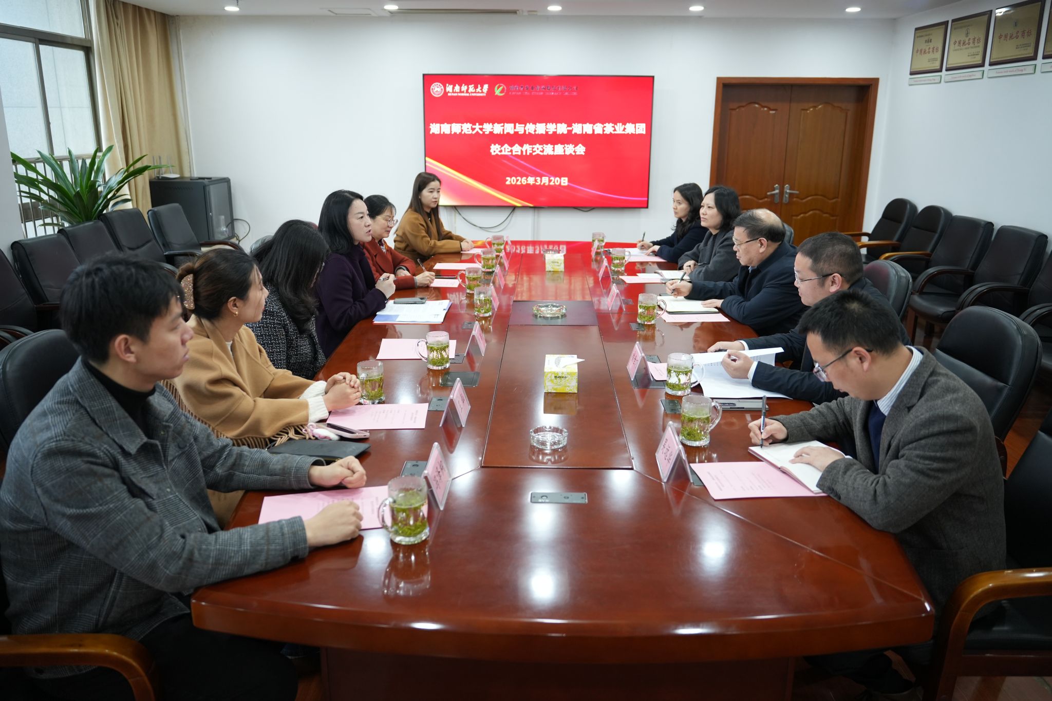 湖南省茶业集团党委书记、董事长周重旺对我院一行表示热烈欢迎,并介绍了企业发展历程、全球市场布局、人才需求规划及岗位设置情况。企业表示,随着品牌传播、新媒体运营、茶文化推广等业务快速拓展,对新闻传播类复合型、应用型人才需求迫切,与我院专业方向高度契合。双方围绕用人需求、岗位标准、职业发展、薪酬待遇等进行深入对接,重点洽谈了新媒体运营、场馆解说、品牌运营、文案策划、媒介推广等领域合作。