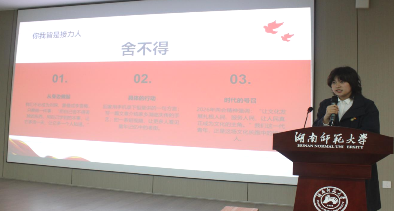 主讲人陈科亦聚焦基层教育,讲述九旬老教师叶连平数十年坚守讲台、用一间小屋点亮乡村儿童梦想的感人故事,生动诠释“立德树人、教育公平”的深刻内涵;主讲人罗子萌以文明传播为切入点,分享文化工作者守护文脉、创新传播、向世界讲好中国故事的实践历程,彰显文化自信的时代价值;主讲人高鸿飞围绕自主创新,讲述青年科研工作者攻坚克难、深耕产业、打破技术壁垒的奋斗故事,展现“实践出真知、磨砺出答案”的实干精神;主讲人龙美萱立足湖湘大地,分享身边青年守护历史记忆、扎根基层服务、助力乡村振兴的青春担当,让“以人民为中心、小我融入大我”的理念落地生根。
