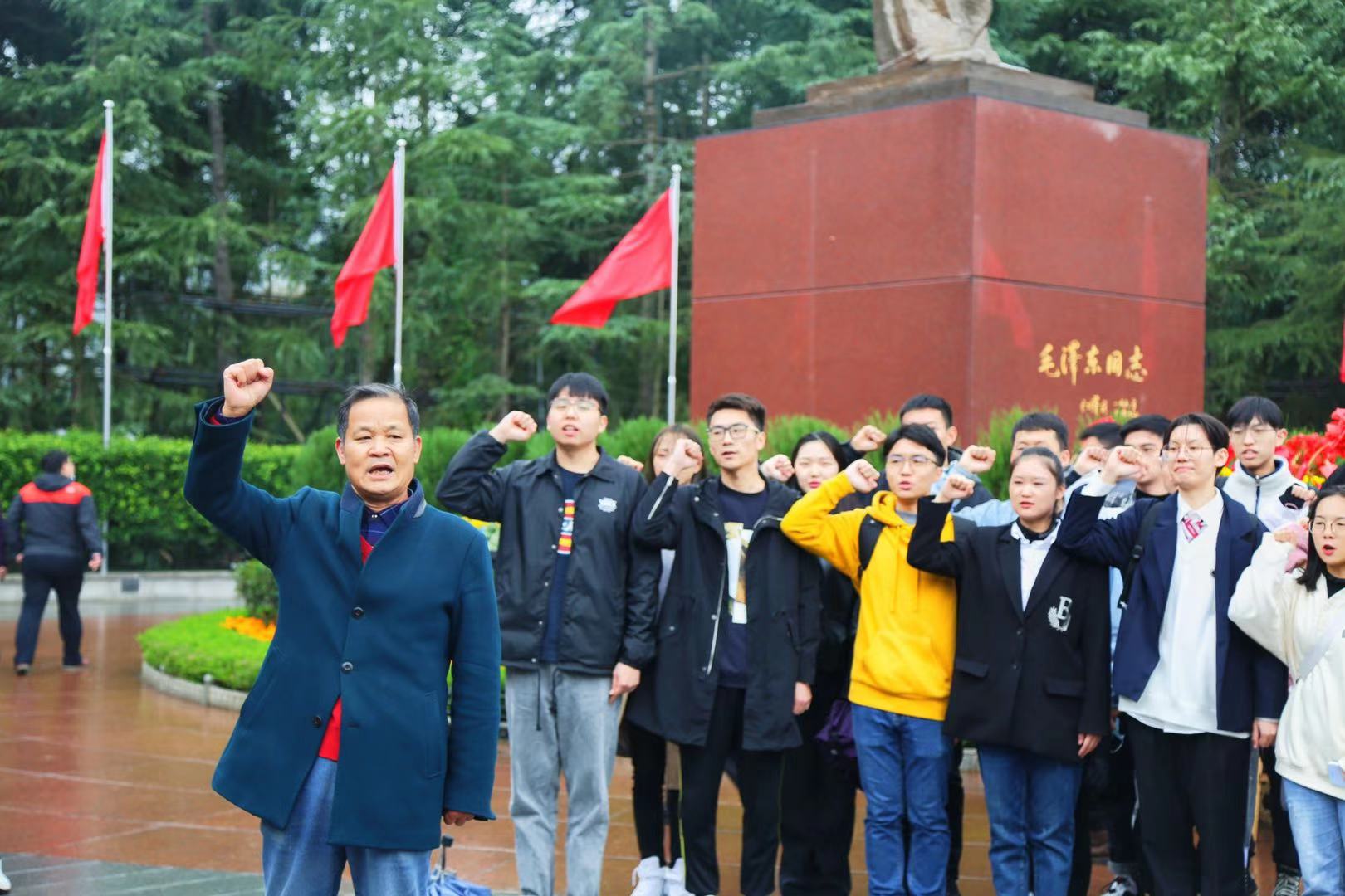 韶峰巍巍,松柏青翠。在毛泽东铜像广场前,关工委罗灵山老师带领全体新老党员宣读、重温了入党誓词;全体师生整齐列队,瞻仰、环绕铜像一周,表达对毛主席的无限敬意和深切怀念。随后,参观了毛泽东同志纪念馆,通过大量详实的照片、文献、实物,重温了毛主席率领中国共产党不惧牺牲、浴血奋战,建设伟大新中国的光辉事迹。