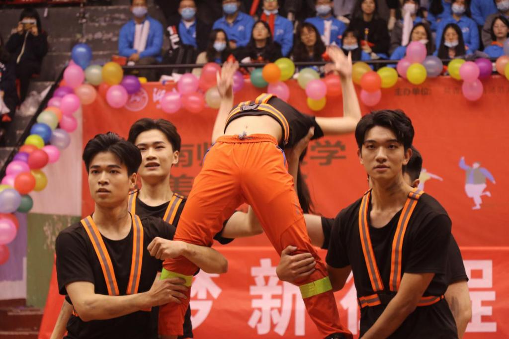 本届健美操比赛以“庆祝中国共产党华诞一百周年”为主题,内容丰富,形式多样。31支来自各院本科生和研究生代表队在赛场上赛出水平、赛出风采。其中,我院带来的是为致敬消防官兵而自行编排的舞蹈《烈火英雄》。新传院学子们身着以橙黄色为主色调的比赛服装,与消防员抢险救援服相似。上场前,他们挺拔地站在候场区,训练有素,整齐划一。比赛场上,他们的每一个动作都淋漓尽致地展现出新传学子的风采,表现出对秉持赤诚之心,背负家国重任的中国消防官兵的崇高敬意。