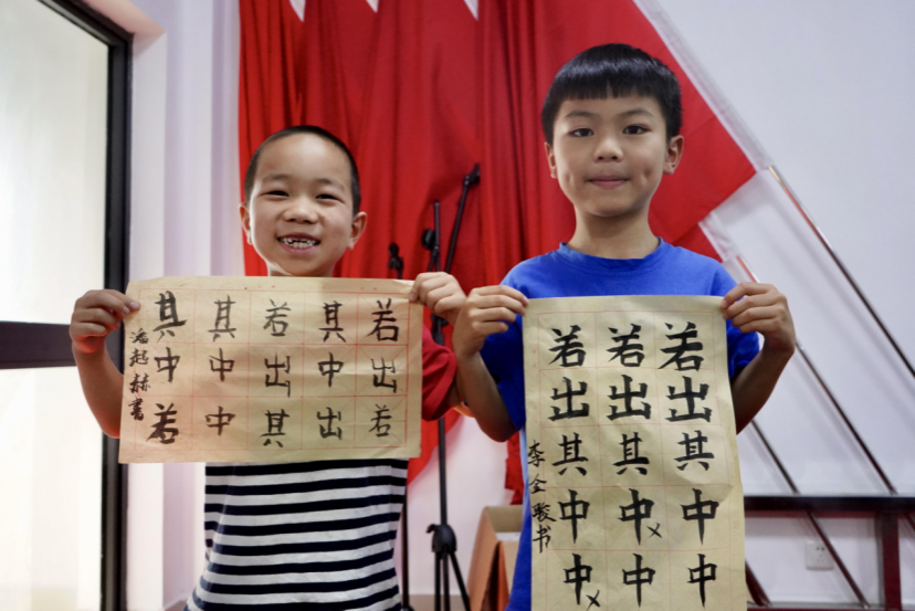 下午的授课中,实践团成员蔡田甜以书法作品《定风波》作为引入,为小朋友们讲解作品背后的历史文化故事,并借由此作品重点强调了书写顺序。她指出:“书法作品的完成需从上至下,从左至右”,并亲自示范。此次课程中,小朋友们第一次用墨水完成书法作品。实践团成员杨佳逸对每人都进行了近身指导,并与他们进行互动交流。在她的鼓励下,小朋友们都可以独立完成“若”“中”等字的书写,将之前所讲在纸上落实。