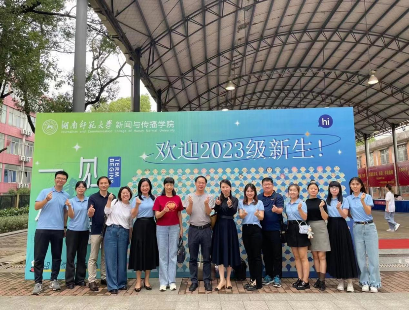 在迎新宣传的工作准备中,学院进行了别出心裁的设计。一是准备一见倾“新”互动画板,摆在主报道点,引导新生进行自画像,共同参与制作特别的新生“大合照”;二是设计迎新KT板,结合学院风格和口号,以“新传新传,名不虚传”、“来新传,有眼光”等文案制作可以手持的迎新KT版,一方面为引导欢迎新生提供了醒目的标志,一方面也创造了学院独具特色的拍照打卡点;三是为新生定制了特色帆布袋,正面以大美师大文创为主要标志,背面则以“书山天下”的字样和书山图标为主要设计,寓意走上书山,向上尚勤;四是设计了新生家长会的邀请函,体现了学院对家校共育的重视;五是准备了新生文化衫,以绿色为主色调,搭配白色的学校简称“HNNU”,洋溢着新生力量的青春活力。