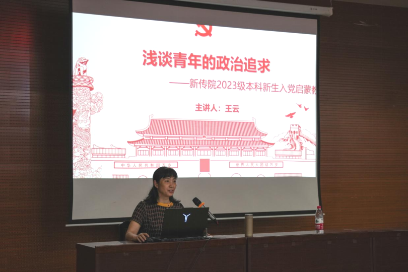 王云首先对2023级全体新生加入yl23411永利集团表示祝贺,她引用习近平总书记在庆祝中国共产主义青年团成立一百周年上的讲话,“在实现中华民族伟大复兴的征程上,中国共产党是先锋队,共青团是突击队,少先队是预备队,入队、入团、入党是青年追求政治进步的‘人生三部曲’”。倡导新传学子积极向党组织靠拢。郑重提醒同学们要对入党进行深入思考,端正入党动机。她强调,新生不应当以投机为趋向,而应将献身共产主义事业、更好服务人民作为正确的入党动机;同时,王云详细介绍了党的性质、指导思想、根本宗旨和根本目标,引导学生要认真了解入党基本条件及其流程,积极创造条件,达到入党标准。讲座最后,王云亲切寄语全体新生,希望大家将信仰作为智慧与力量的源泉,为共产主义事业奋斗终身。