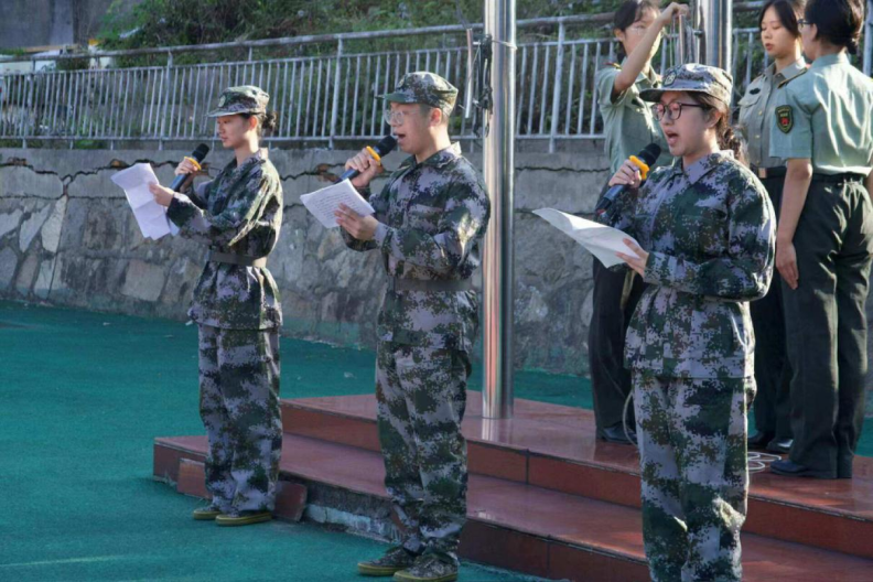新生代表集体在国旗下发言,以学生身份表明对军训的决心与展望。他们代表全体新生发表了对军训的深刻认识:第一,军训是对革命精神的传承及对时代精神的发扬;第二,军训能帮助全体新生迎难而上、蜕变自我;第三,军训需要全体新生励志奋斗、持之以恒。最后,他们预祝各位同学通过军训锤炼意志、砥砺自我,成为大有作为的时代青年。