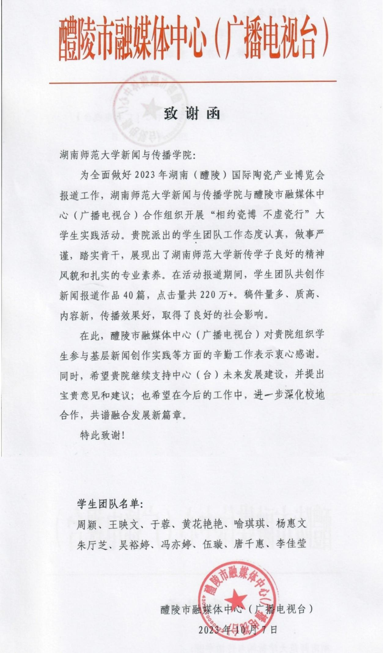 “采庶子之春华,忘家丞之秋实”,一分耕耘就会有一分收获,12名同学的稿件量多、质高、内容新,在醴陵发布微信公众号、抖音号上均获得良好的社会反响,12名同学的辛勤努力也在醴陵融媒工作人员的心中留下了深刻记忆。编审部在职员工曾表示:“她们在瓷博会期间表现非常棒,很好地展现了师大学子的风采。”
