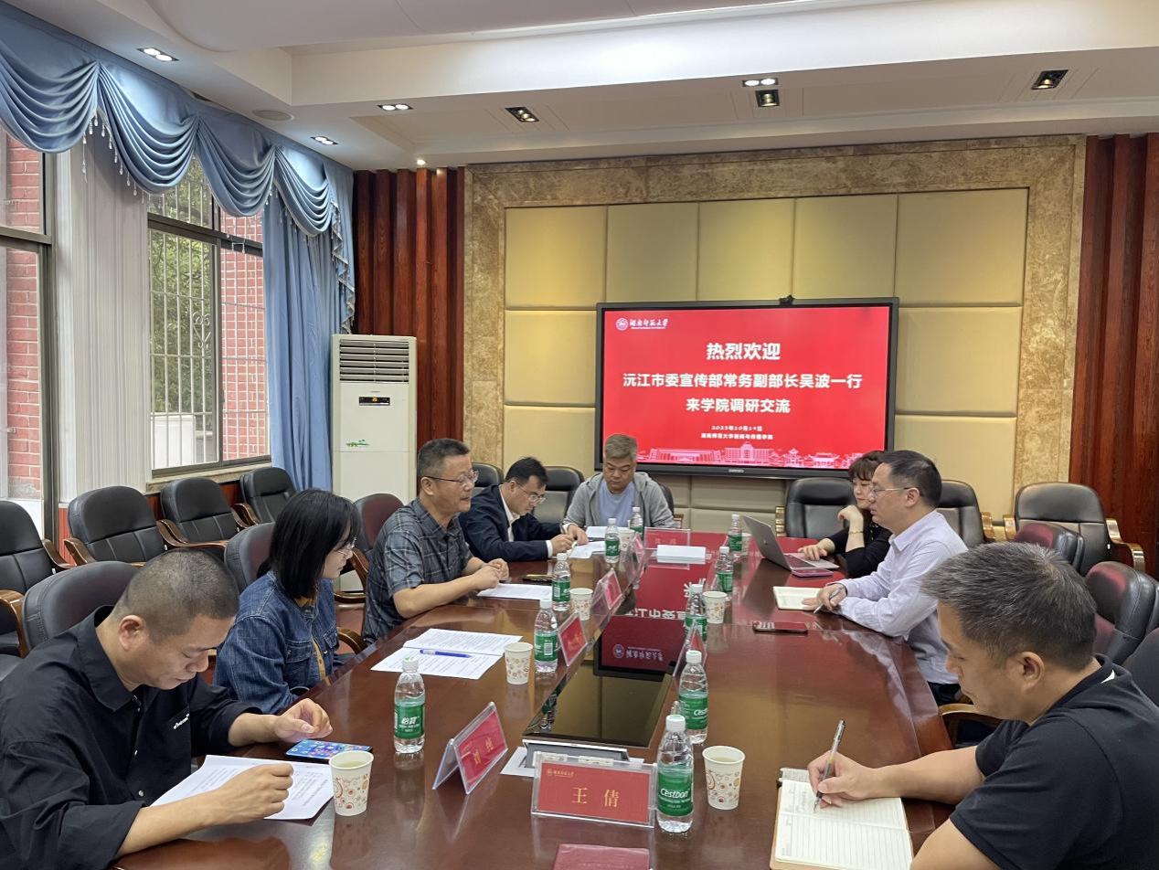 (通讯员 王倩)为加强校媒深度合作,探索建立高校与地方党媒协同育人机制,大力培养全媒体人才,讲好湖南故事,传播湖湘文化。10月19日上午,沅江市委宣传部常务副部长吴波,沅江市融媒体中心主任胡增荣一行五人前来我院调研交流,我院党委书记沈贤岚、县级融媒体建设研究中心执行主任方提教授等参加会议。