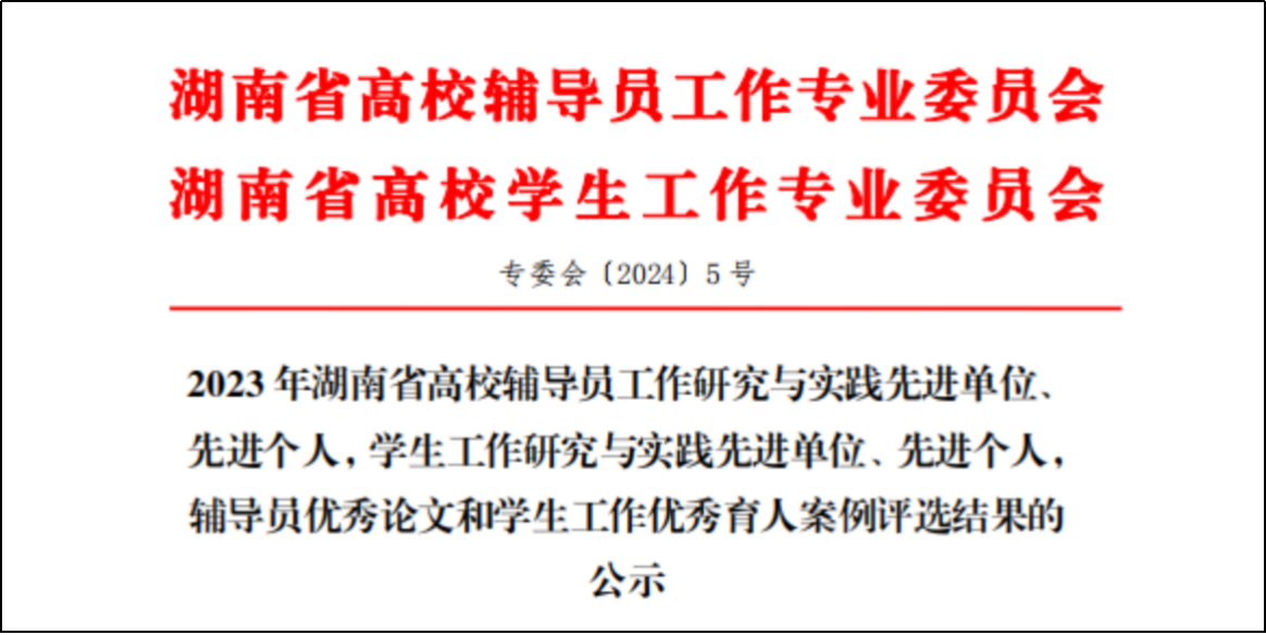 (通讯员 刘乐怡)2023年湖南省高校辅导员工作研究与实践先进单位、先进个人,学生工作研究与实践先进单位、先进个人,辅导员优秀论文和学生工作优秀育人案例评选结果近日揭晓,我院2020级辅导员陈安琪荣获“2023年湖南省高校辅导员工作研究与实践先进个人”称号,2022级辅导员王洋参与撰写的论文荣获2023年湖南省高校辅导员优秀论文。