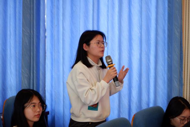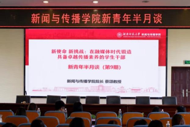 蔡颂以“新时代 新青年 新作为:在融媒体时代锻造具备卓越传播素养的学生干部”为中心进行交流。他围绕“何谓新青年”“为何新青年”“新青年何为”三个方面与同学们展开交流讨论。蔡颂表示,“新青年”是一本杂志,更是一群人和一种精神,而后,他与在座同学重温学院院史,强调学院学生干部需爱院、荣院、兴院,并努力在实践中获得新知,成为具有师大新传气质的新青年。蔡颂鼓励同学们提高听、说、读、写这四项能力,拓宽视野格局,努力成为拔尖创新型人才。随后,蔡颂送给同学们“性格决定命运”“思路决定出路”“细节决定成败”三个锦囊,勉励同学们与“三个锦囊”携行,在不断的反思中启获新知。