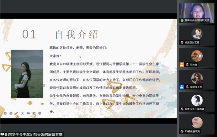 会上,我院校级干部姜晓非、张艺馨、荣浩浩、冯珂瑶、赵航航、郑嘉敏以及院级干部刘雅婷、庞硕、彭天媛、何艾飞、张雅婷、李嘉圃总结了近一年的工作,做出了详细的述职报告。
