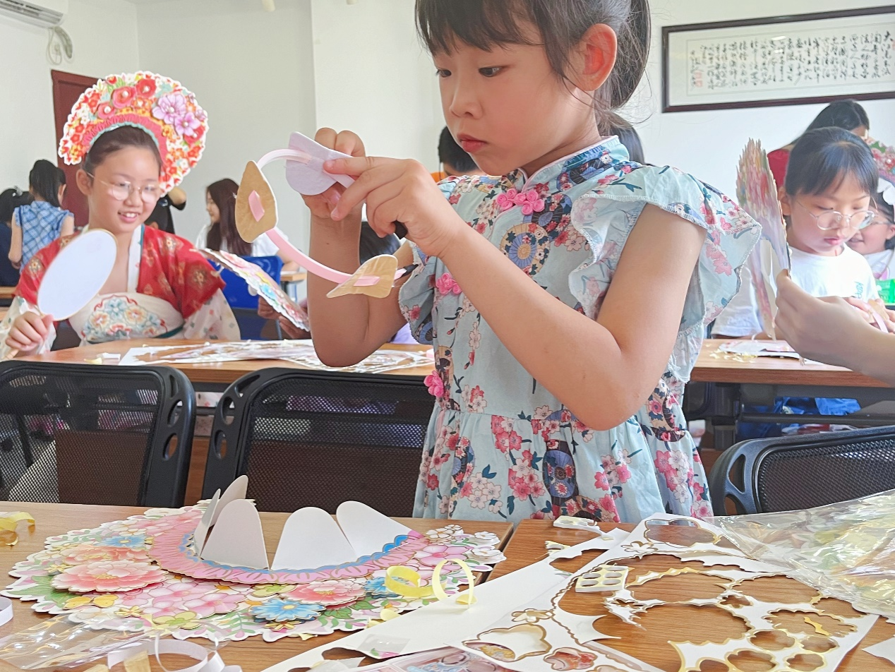 簪花文化在我国已有两三千年的历史,是国家非物质文化遗产之一。此次活动中,志愿者们以唐代周昉的《簪花仕女图》为引入,介绍了簪花的起源、佩戴方式以及制作发簪的基本材料和方法,与小朋友们一同品味古风雅韵,感受传统技艺。在志愿者们的带领下,小朋友们自己动手,运用各种工具,精心组合搭配各式花片,将零碎的材料巧妙地黏合,制作成了精美的簪花。一点心思、一双双巧手,制得的每件作品都有自己的风格,精美华丽却又不落俗套。
