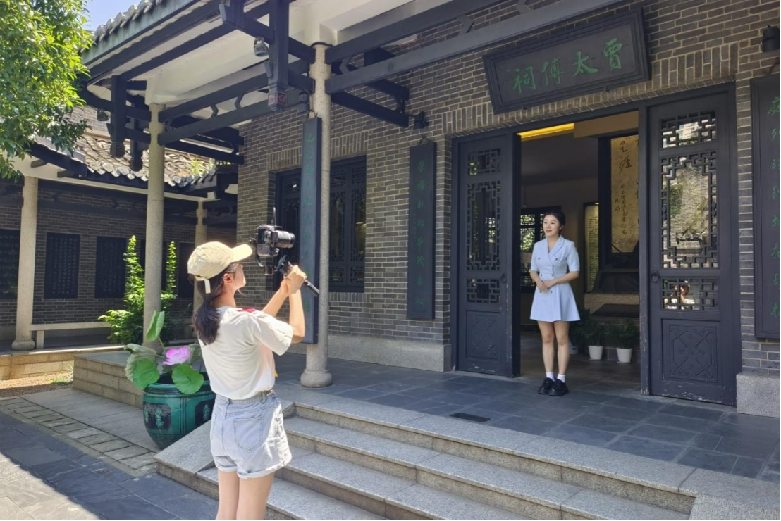 7月6日中午,实践团前往贾谊故居进行拍摄。“贾谊一生心忧天下,政论疏阔。”贾太傅祠中展示了《吊屈原赋》《鹏鸟赋》等旷世宏文。碑廊内陈列的《古今名人咏贾诗选刻》及故居碑文体现了贾谊的廉洁作风对后世的深远影响。主持人在祠前讲述了贾谊政治生涯中的贡献,重现了贾谊仁礼结合的政治蓝图和以民为本的初心之志。团队成员通过景别切换,用镜头记录了贾谊廉洁的一生。