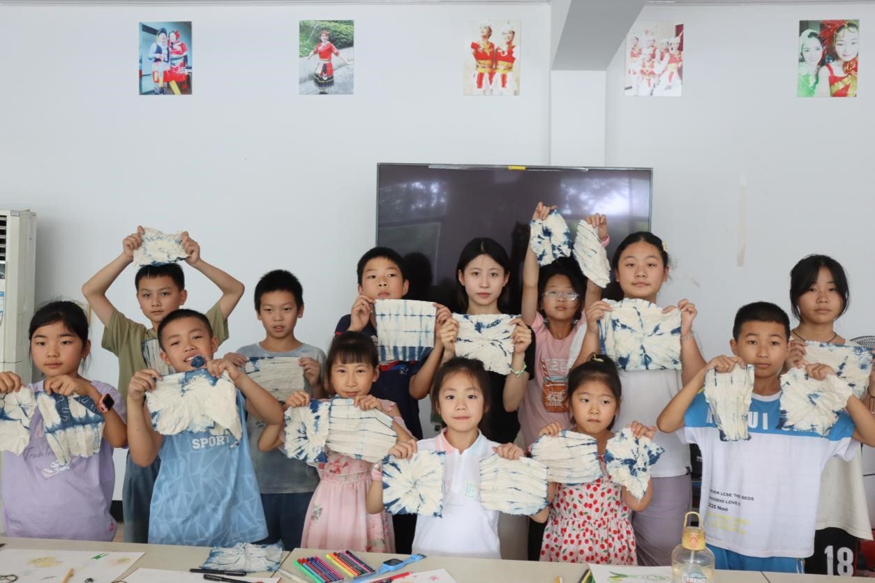 此次课程内容包括手工扎染作品展示和手抄报制作活动。实践团通过晾晒好学生们上节课制作的扎染手工作品,带领他们亲自拆解染布,共同讨论扎染独特纹理的形成原理,引导学生们在实践中真切掌握扎染。