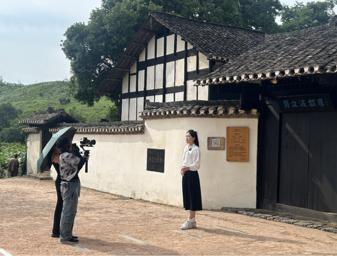 实践团前往周立波故居取景拍摄,主持人步入故居,向我们诉说周立波的人生故事。通过对周立波人生历程的了解,实践团感受到他深入人民,扎根农村坚定初心。进入故居堂屋的人行道路两侧,不同造型的铜像与立牌,向团队成员讲述了周立波在乡村住土屋、干农活与邻里之间打成一片的故事。实践团通过采访参观者、拍摄故居内部布局、主持人讲解等方式,丰富拍摄内容,增强公众了解我国的现当代爱国作家的主动性,让爱国基因代代相传。