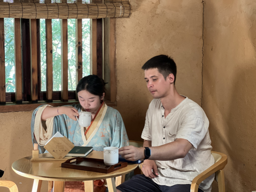 俄罗斯籍博士生与主持人在白马茶驿品茶