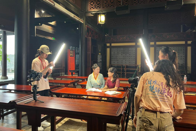 屈子书院是目前中国国内最大的榫卯结构穿斗式全木仿古建筑,由求索堂、沅湘堂、独醒楼、悲士亭、沧浪台等19个单体组成。在屈子书院开展拍摄活动,实践团成员与中华优秀传统文化近距离接触,感受其跨越时空、源远流长的精神力量。“朕幼清以廉洁兮,身服义而未沫。”屈子学堂内摆放着古代中式桌椅,印度尼西亚籍研究生坐于其中,提出对于屈原典故的疑惑不解,主持人身着汉服,将其初心与廉洁的起源娓娓道来。实践团成员将屈原的廉洁思想以生动的视觉形式呈现,有利于激发新一代青年人对个人品德和社会伦理的思考。