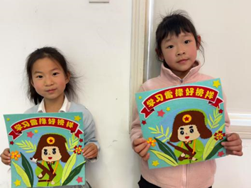 手工制作环节。志愿者们分发了手工材料,指导小朋友们制作雷锋手工画。小朋友们在志愿者的引导下,进行剪裁、粘贴,用画笔描绘出雷锋的形象。