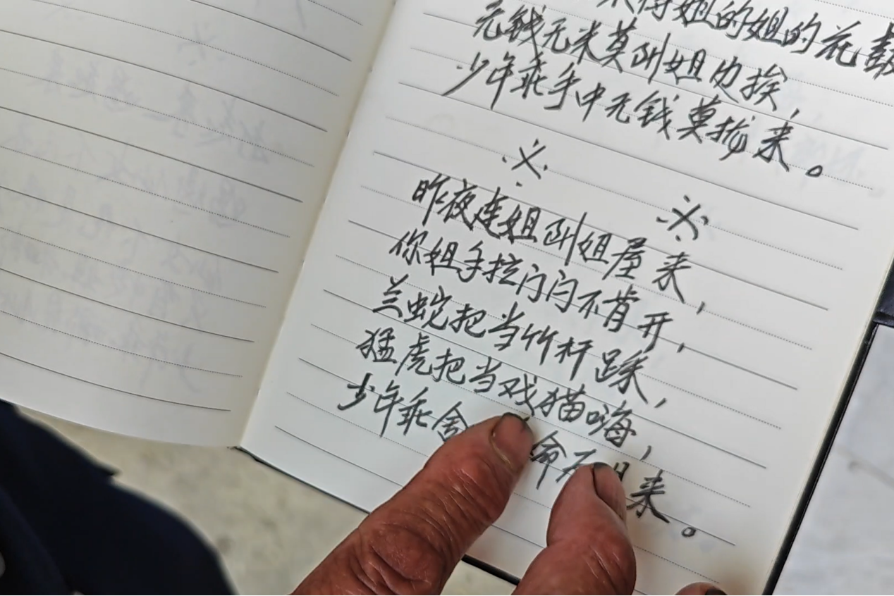 此外,实践团还与市级非遗传承人陈治安深入交流。这位77岁的特聘教师风雨无阻,每周二、周四都会来到学校教授呜哇山歌。在与实践团交流时,他展示了自己珍藏多年的手写呜哇山歌集,厚厚的本子里收录了两千余首山歌,全部出自老人之手。这些山歌多为劳动号子,承载着深厚的生活气息。