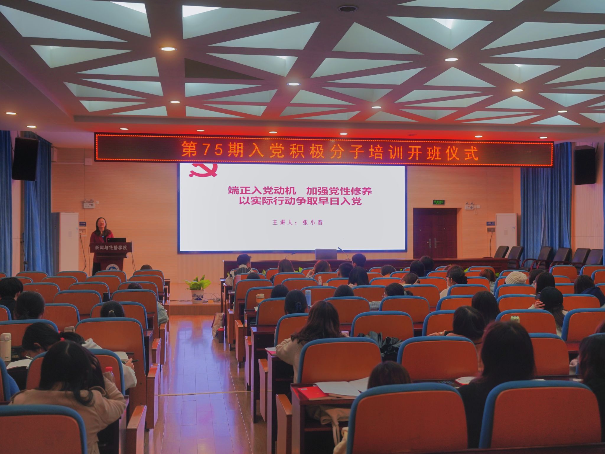 开班仪式结束后,张小春以“端正入党动机,加强党性修养,以实际行动争取早日入党”为题为学员授课。她提出,入党积极分子入党要做到以下四点:一要端正入党动机,在思想上入党;二要加强党性修养,在行动上入党,三要完成发展手续,在组织上入党;四要明白入党含义,做合格党员。她希望在场学员能够坚定理想信念,践行社会主义核心价值观,砥砺意志品质,勉励同学们牢记宗旨,争做模范,早日成为正确认识历史使命、勇于担当时代大任的合格党员。