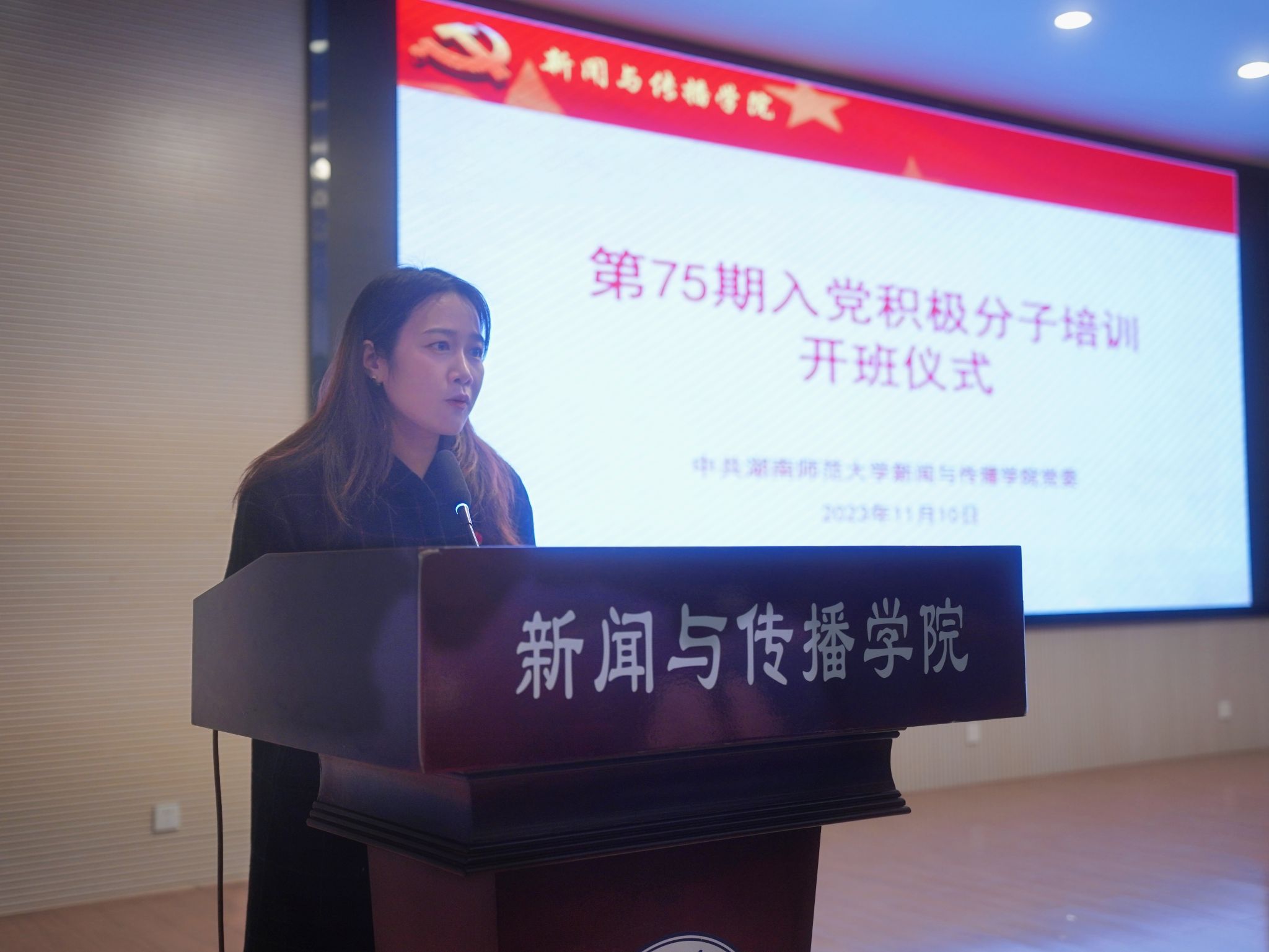 2022级网络与新媒体专业本科生吴世辉作为入党积极分子代表上台发言。他分享了南海舰队军旅中、抗疫志愿者岗位上与中国共产党的故事,以所见、所思、所感阐释了他对党的认识。他倡议所有入党积极分子保持“提交入党申请书时的纯粹”,坚定守护初心信仰。